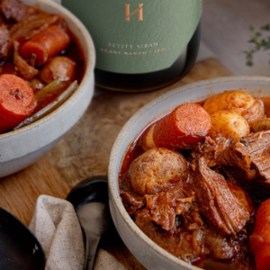 Pair with Henry Ranch Petite Sirah Prep Time: 20 Minutes | Cook Time: 2hrs 35 mins. | Serves: 8-10 It is the ultimate cold-weather comfort food. Chunks of well-marbled beef are seared in a hot pan, then gently braised with onions and spices in a rich wine-based broth. After a couple of hours in the oven, the meat becomes meltingly tender and enveloped in a deeply flavorful sauce. It takes time to make, but the recipe is mostly hands-off. Go ahead and make it a day or two ahead of time; the flavor…