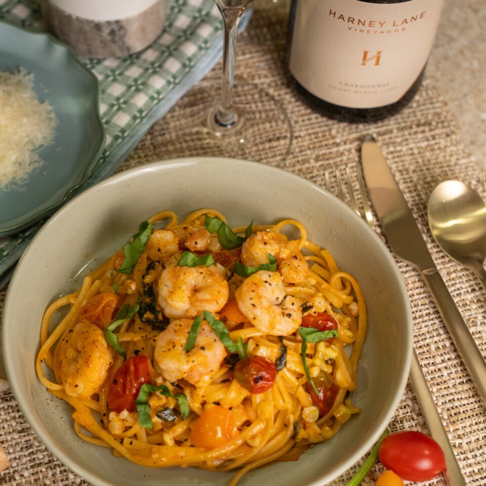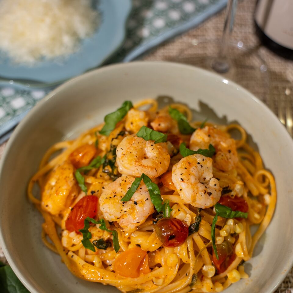 A seriously delicious fresh pasta dish. Creamy, silky noodles, garlicky shrimp, and a punch of fresh corn, cherry tomatoes, and basil.
